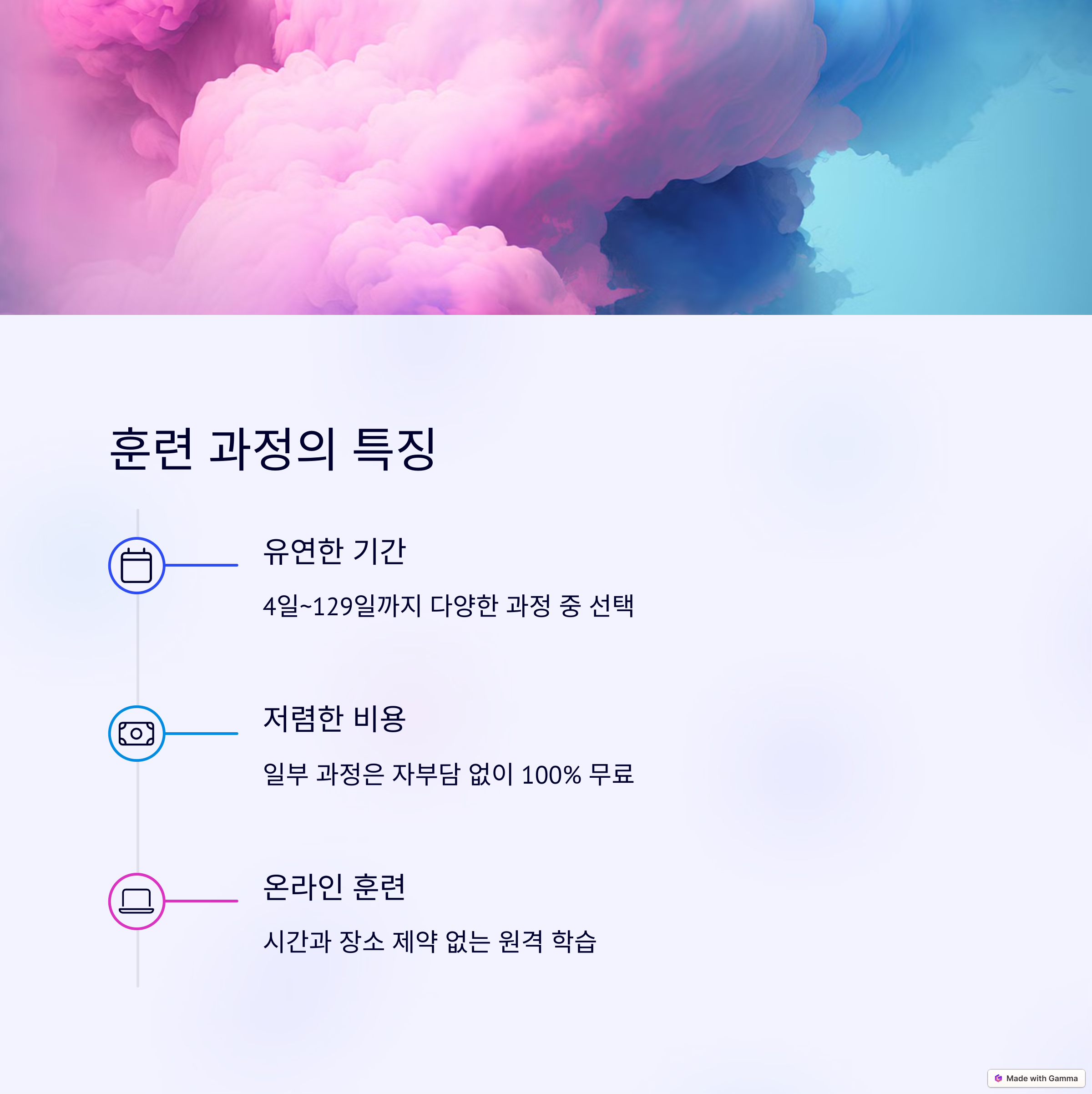 국민내일배움카드를 통해 최대 500만 원까지 훈련비를 지원받을 수 있으며, 일부 대상자는 전액 무료로 수강 가능합니다. 원격훈련 시스템을 통해 시간과 장소 제약 없이 학습이 가능하고, 월 최대 11만 6천 원에서 31만 6천 원까지 훈련 장려금도 받을 수 있어 경제적인 부담 없이 기술과 역량을 키울 수 있습니다. 지원 과정과 자격 여부는 HRD-Net에서 미리 확인해두면 좋습니다.