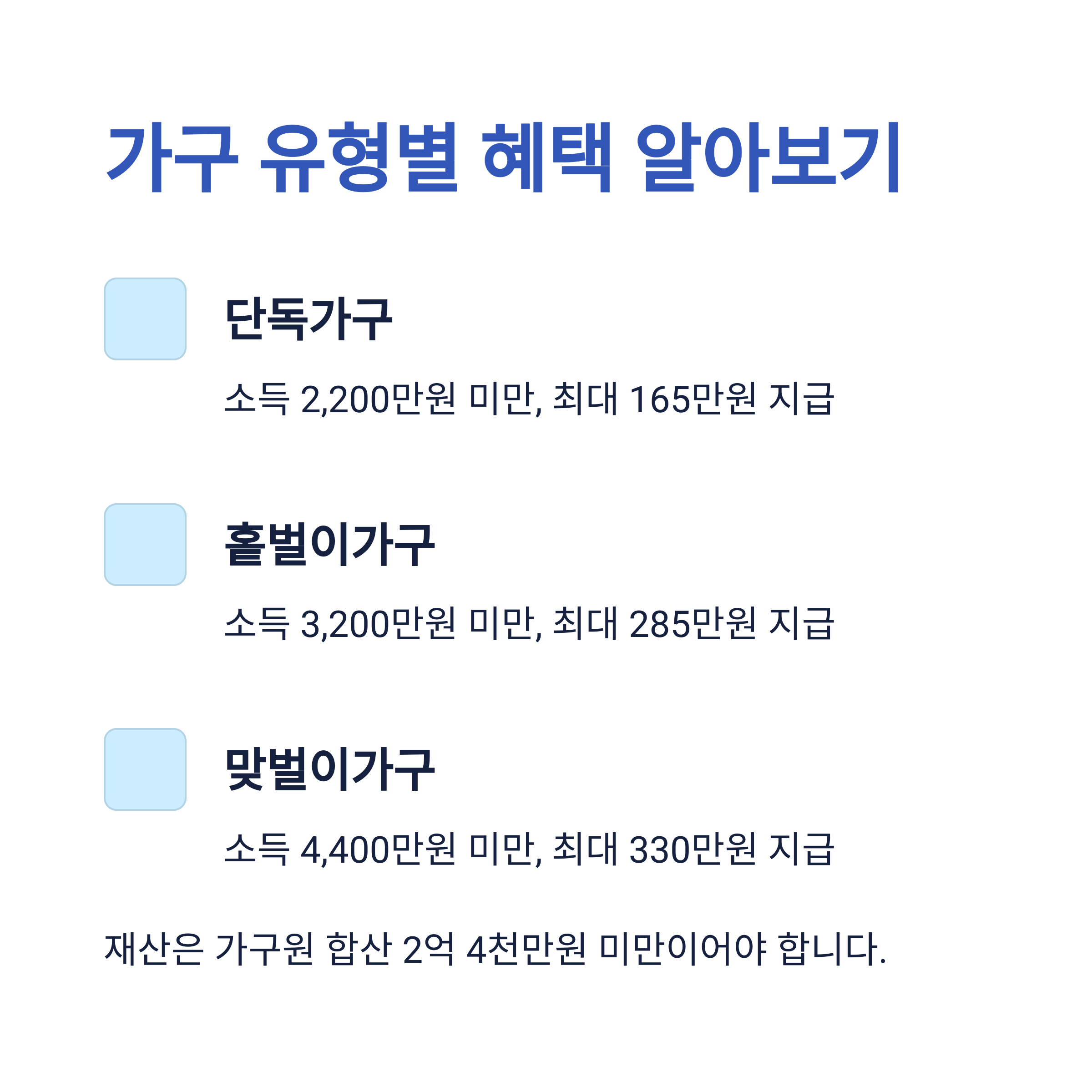 - 가구원이 보유한 재산의 합계액이 2024년 6월 1일 기준 2억 4천만 원 미만