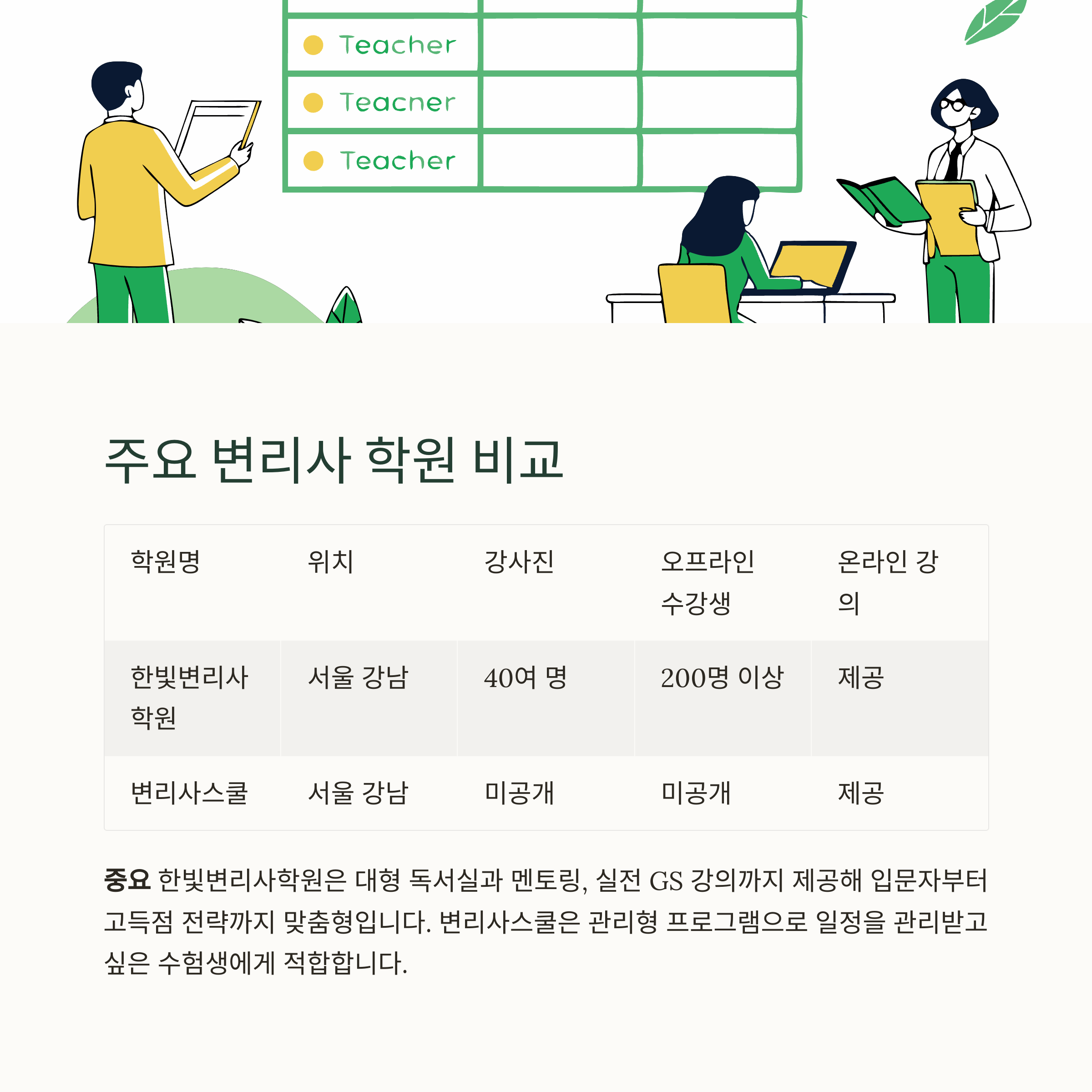 | 한빛변리사학원 | 서울 강남 | 40여 명 | 200명 이상 | 제공 | 최신 경향 반영, AI 자막 강의, 독서실 150석, 무료 상담 |