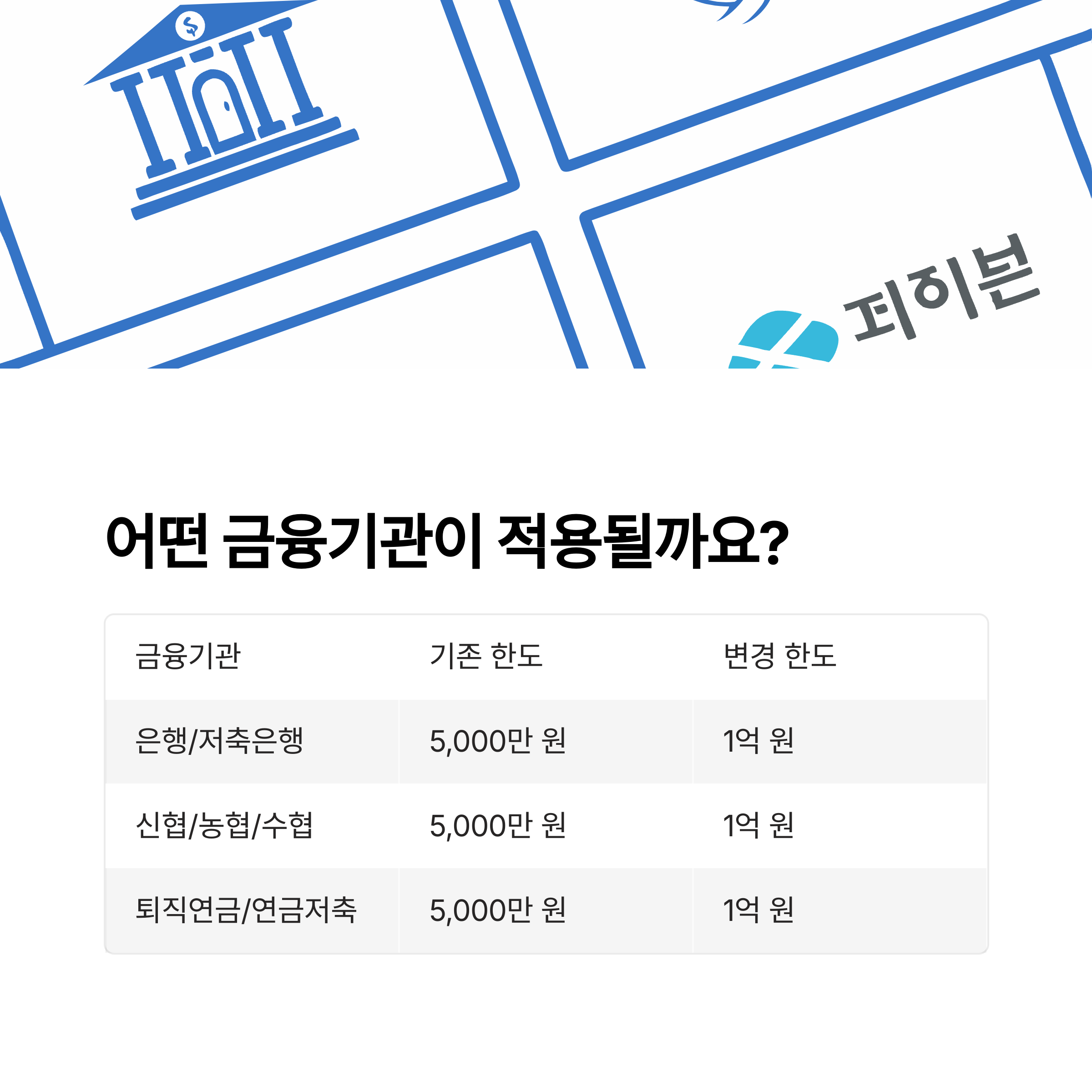 모든 예금 보호 대상 금융기관과 상품이 이번 한도 상향의 적용을 받습니다.