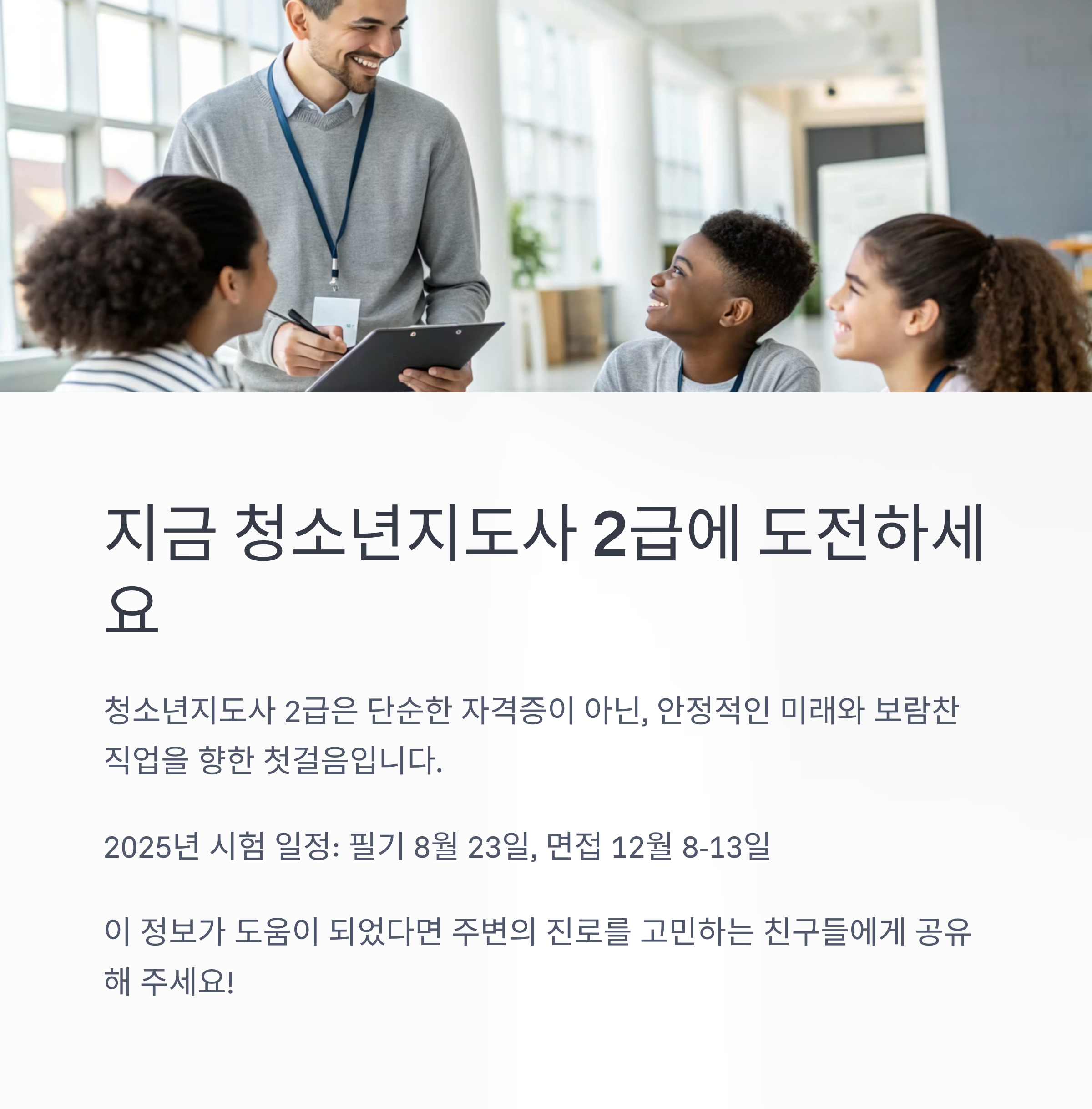 청소년지도사 2급은 단순한 국가자격증을 넘어 청소년 복지 현장의 핵심 인재로 성장할 수 있는 기회를 제공합니다. 청소년 관련 기관 취업부터 정책 개발, 상담, 진로 코칭까지 광범위하게 활용되며 직업 안정성과 사회적 가치까지 갖춘 자격입니다. 특히 필기시험 면제 조건을 충족하면 합격 부담이 줄어들어 실무 중심의 경력 설계가 더 쉬워집니다.