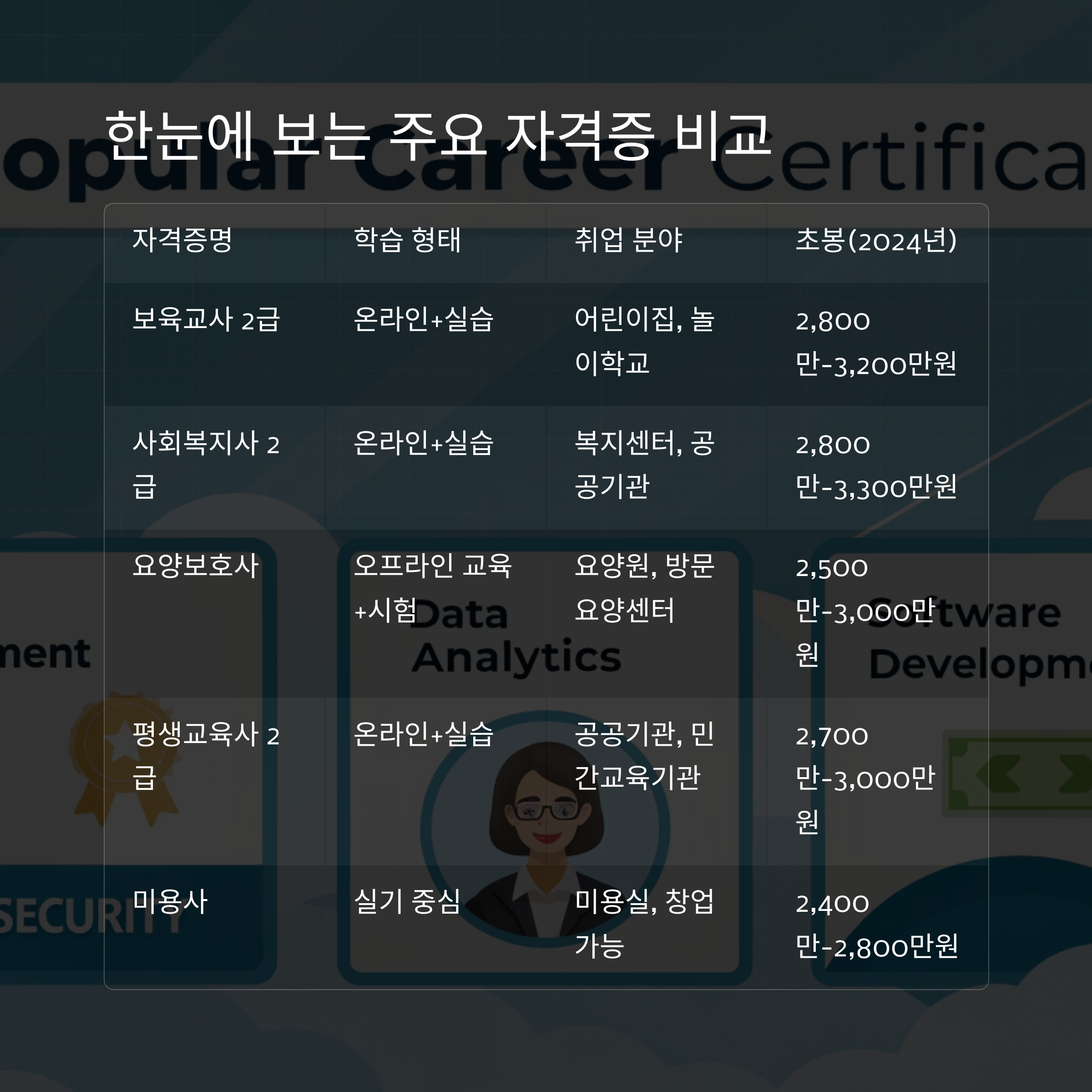 | 사회복지사 2급 | 온라인+실습 | 복지센터, 공공기관 | 2,800만~3,300만원 |