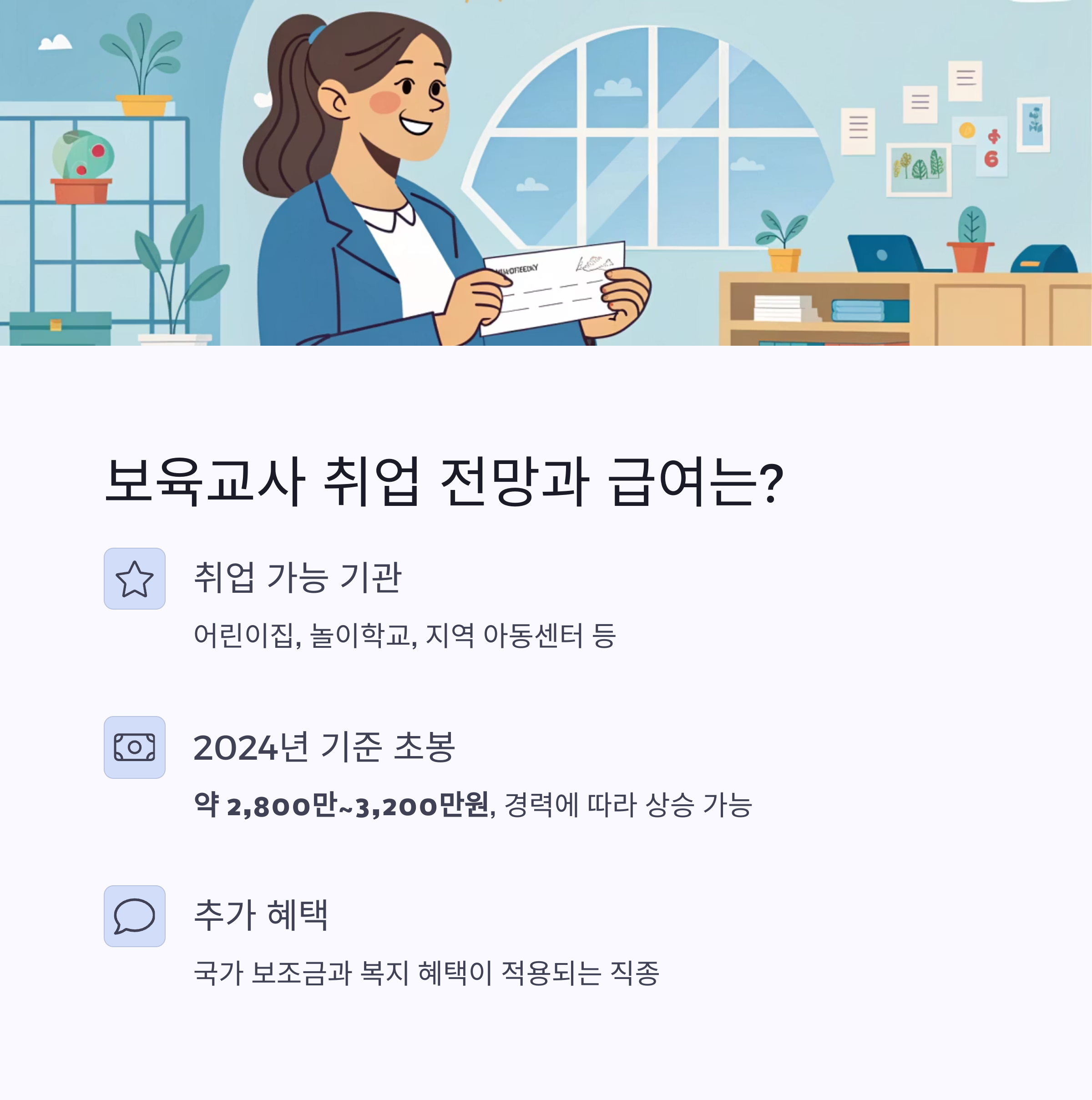 | 보육교사 2급 | 온라인+실습 | 어린이집, 놀이학교 | 2,800만~3,200만원 |