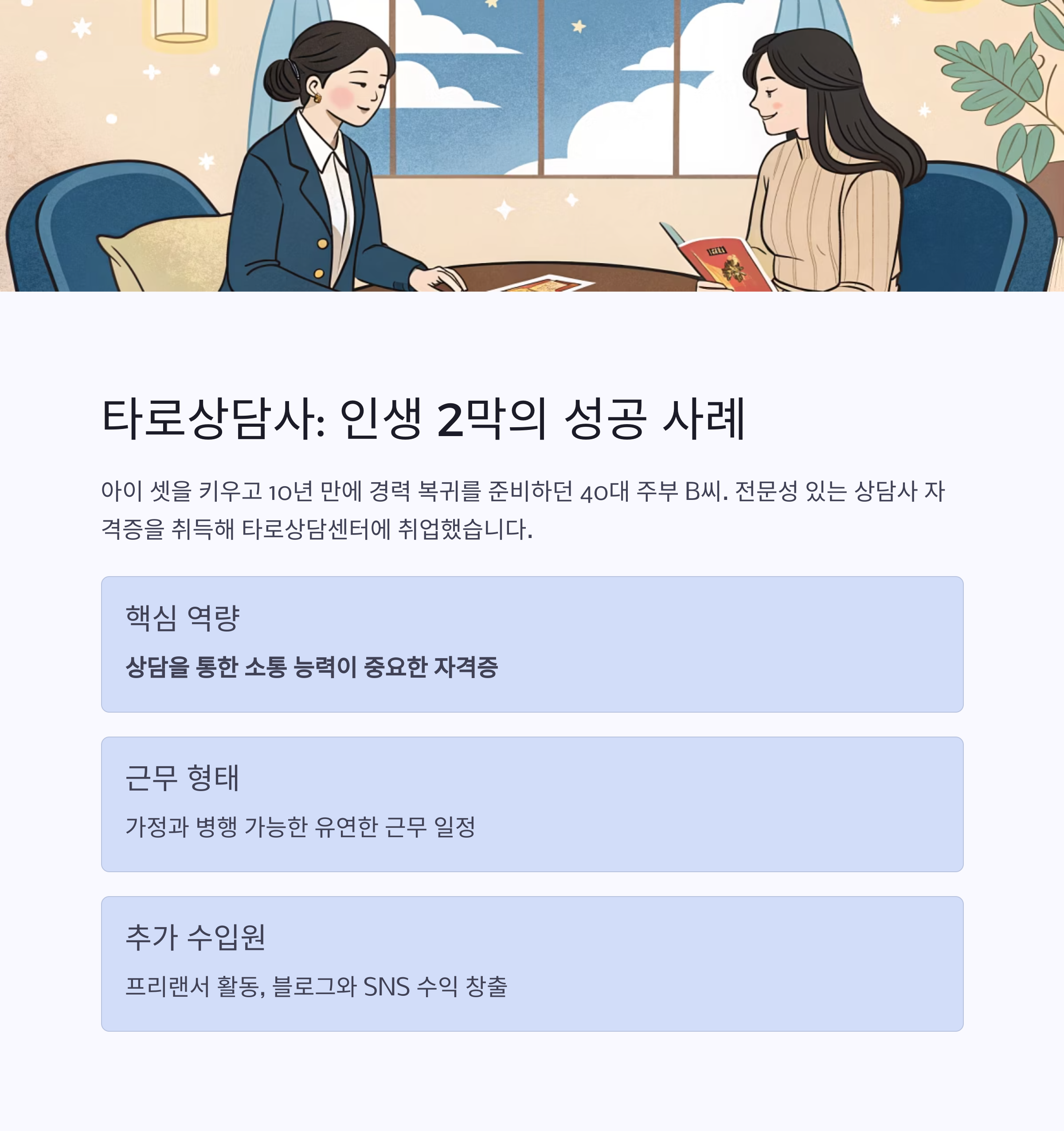 자격증 취득은 그 시작점으로, 비교적 짧은 시간과 실질적인 취업 가능성을 갖춘 자격증들이 특히 경단녀에게 유리합니다.