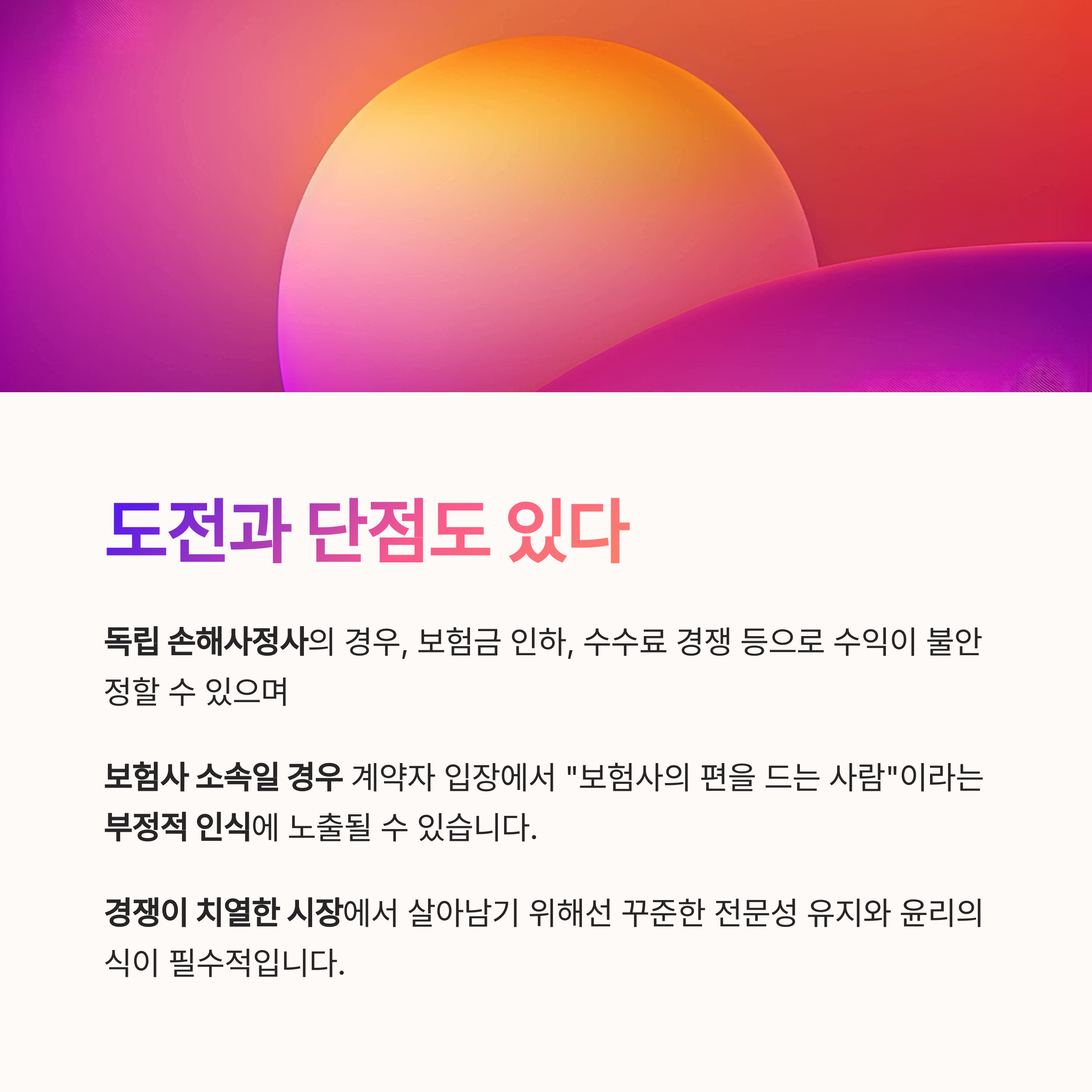 "보험사의 편을 드는 사람"이라는 부정적 인식에 노출될 수 있습니다.