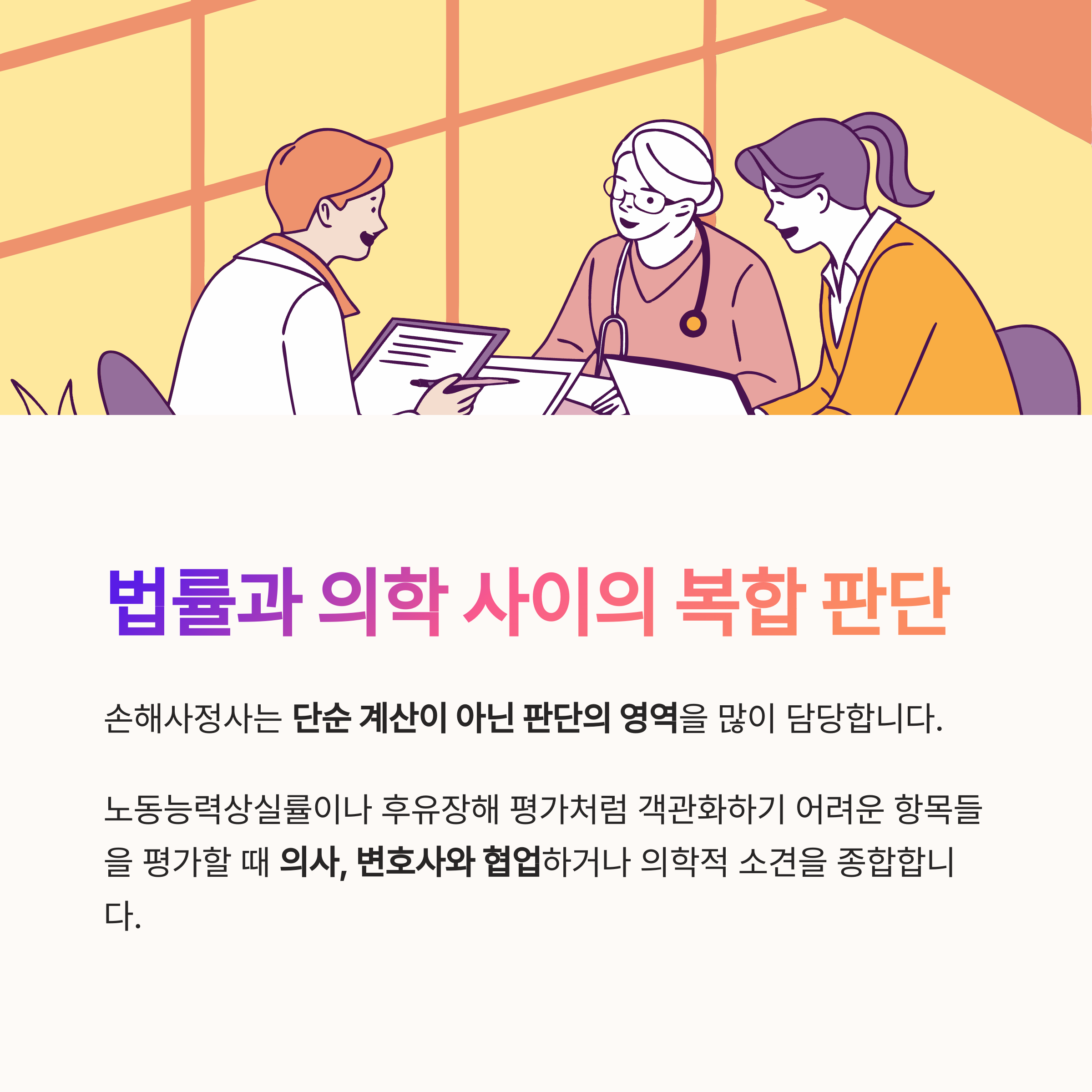 손해사정사는 단순 계산이 아닌 판단의 영역을 많이 담당합니다.