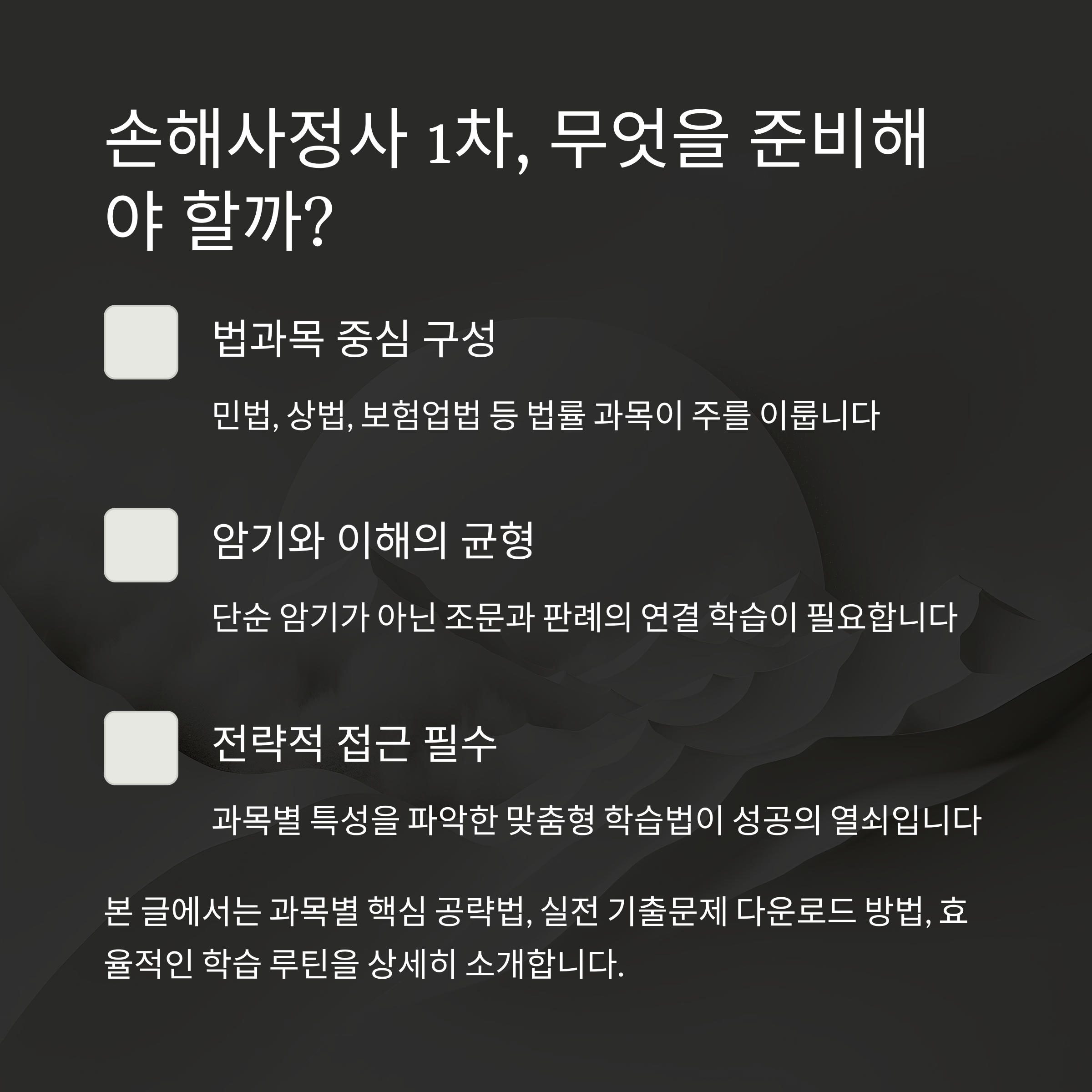 손해사정사 1차 시험은 방대한 이론과 법률 중심 과목으로 구성되어 있어 전략적인 접근이 필수입니다.