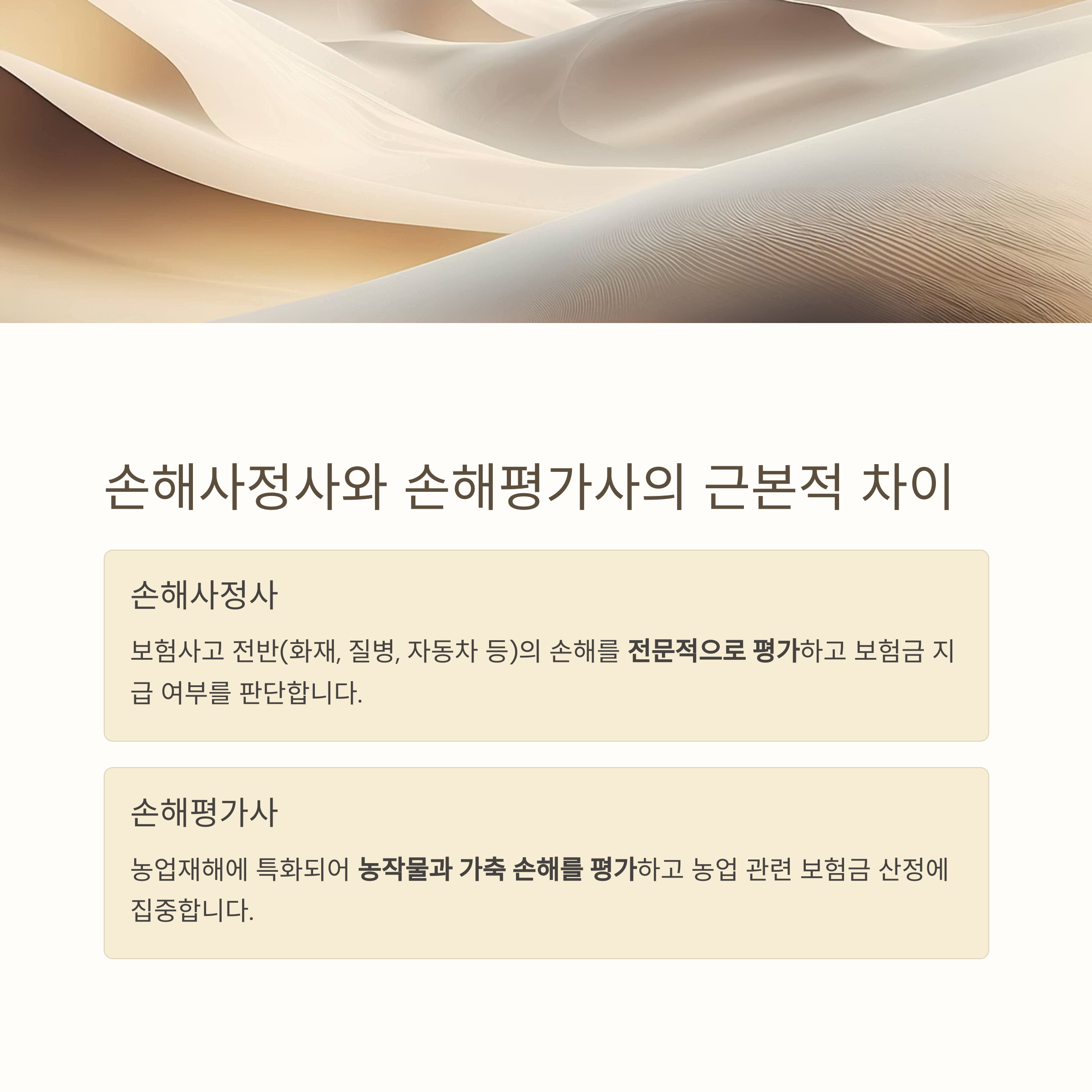 농업재해에 특화되어 농작물과 가축 손해를 평가하고 농업 관련 보험금 산정에 집중합니다.