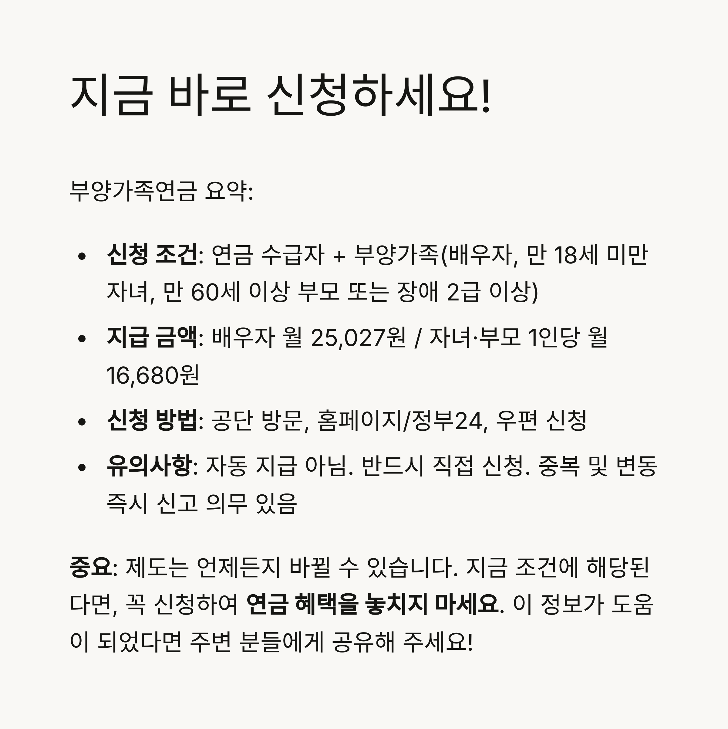 - 유의사항: 자동 지급 아님. 반드시 직접 신청. 중복 및 변동 즉시 신고 의무 있음