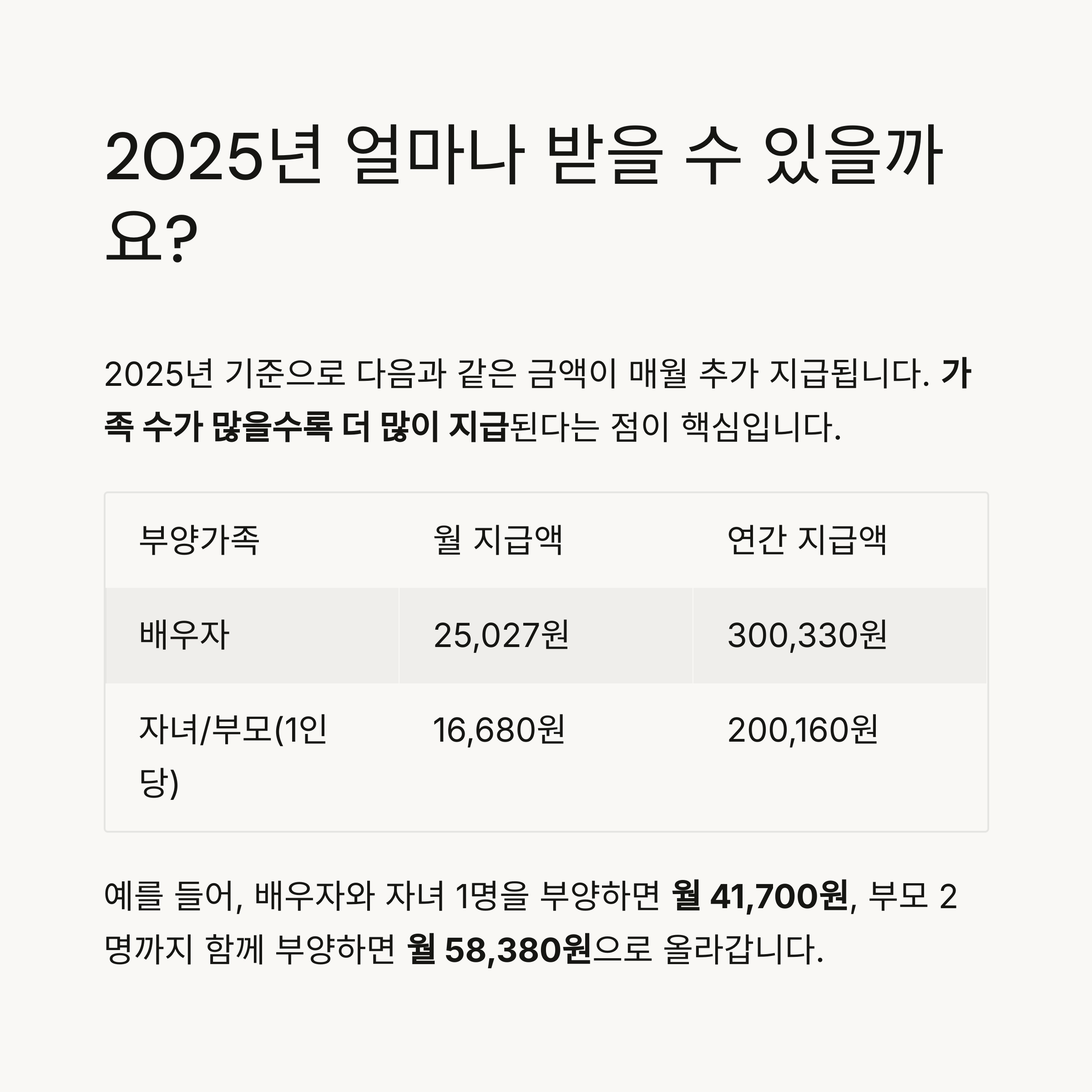 - 지급 금액: 배우자 월 25,020~25,027원 / 자녀·부모 1인당 월 16,680원