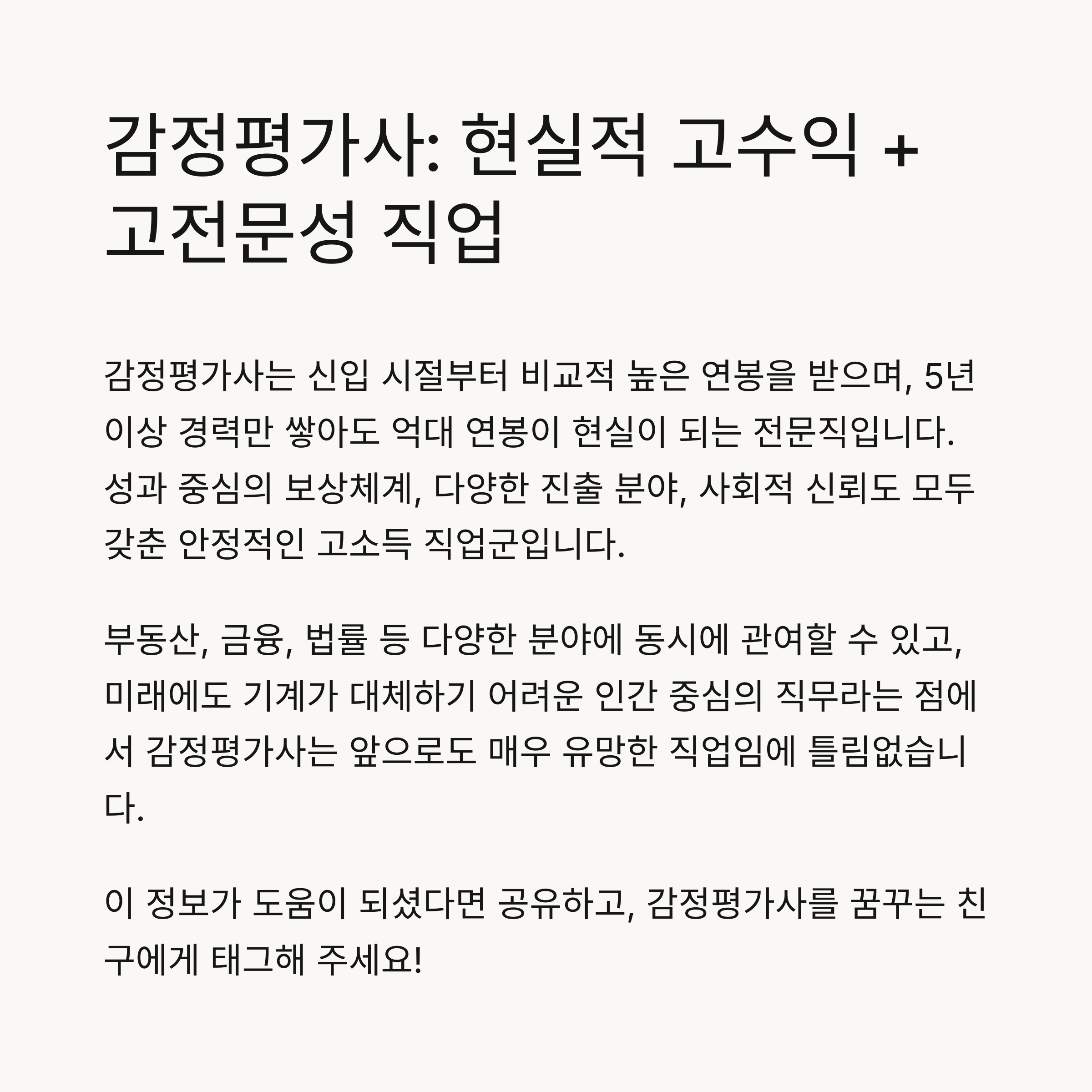 결론: 감정평가사는 현실적 고수익 + 고전문성 직업이다