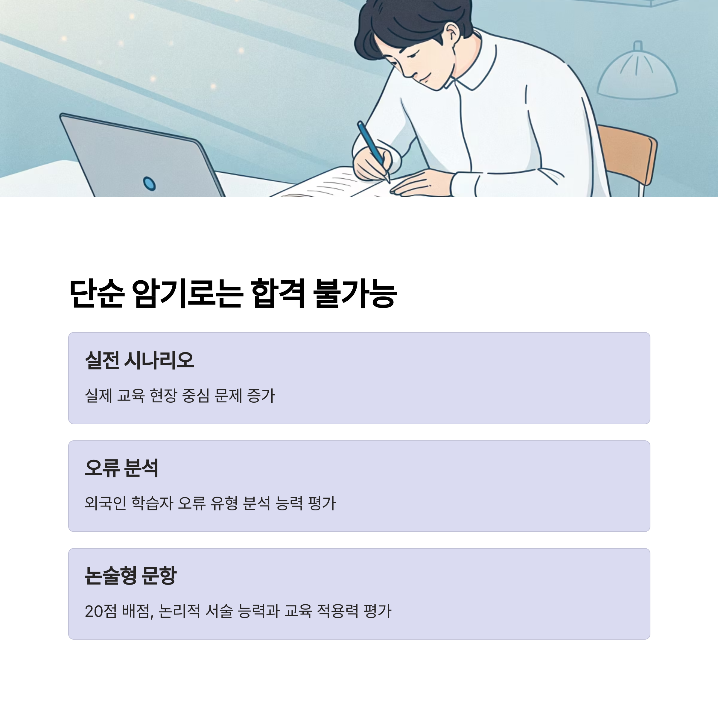 이 시험은 한국어 교육 현장에서 실제로 필요한 실무 능력, 논리력, 교육 적용력을 두루 갖춘 사람을 선발하기 위한 구조로 설계되어 있다.