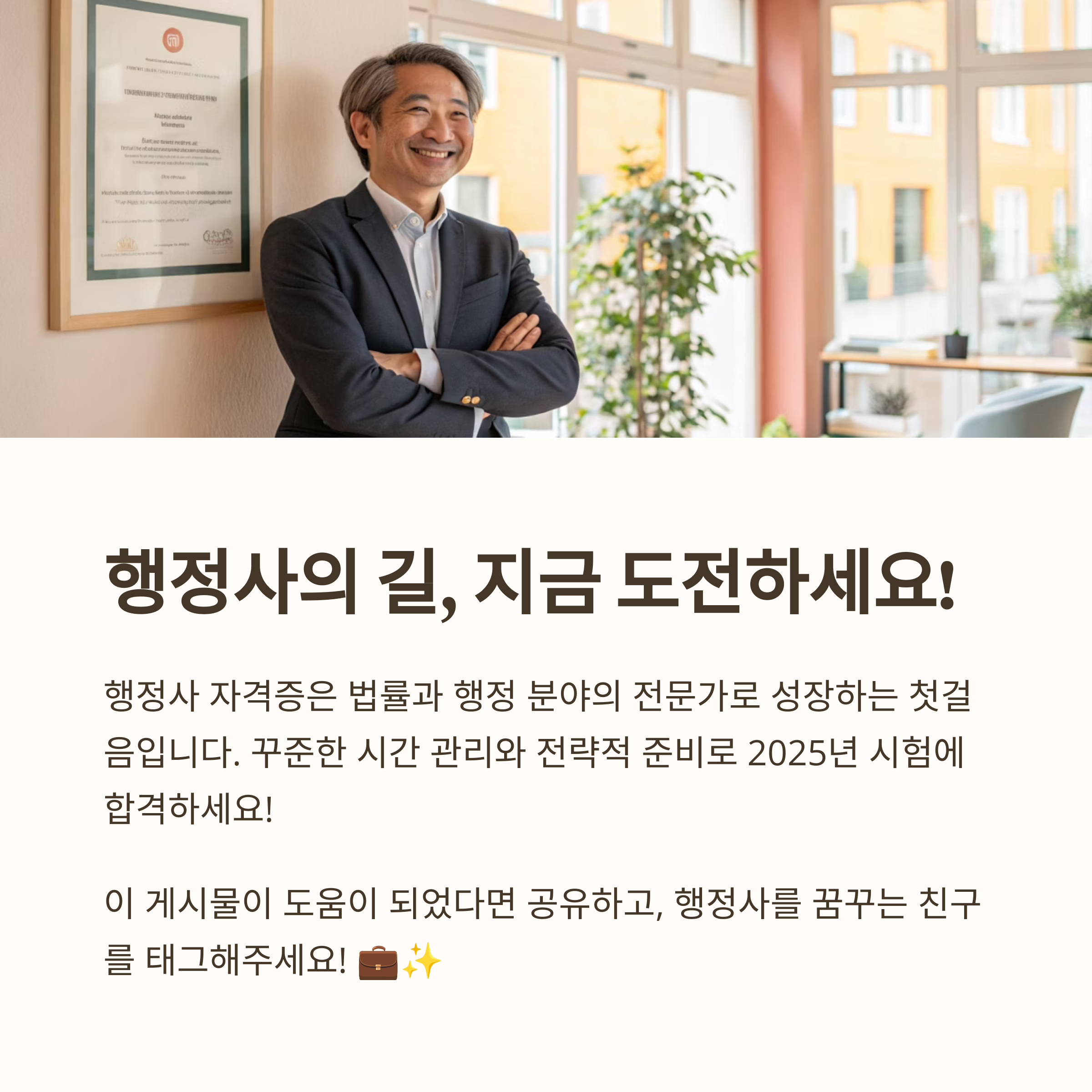 행정사 자격증 취득은 단순히 시험을 통과하는 것을 넘어, 법률과 행정 분야에서 전문성을 갖춘 전문가로 성장하는 첫걸음입니다. 수험생들은 최신 시험 일정과 제도를 철저히 숙지하고, 반복 학습과 실전 연습을 통해 실력을 다져야 합니다. 무엇보다 꾸준한 시간 관리와 전략적인 준비가 합격을 좌우한다는 점을 명심하시기 바랍니다. 2025년 시험을 준비하는 모든 수험생들이 이 글을 통해 합격의 길로 나아가길 응원합니다.