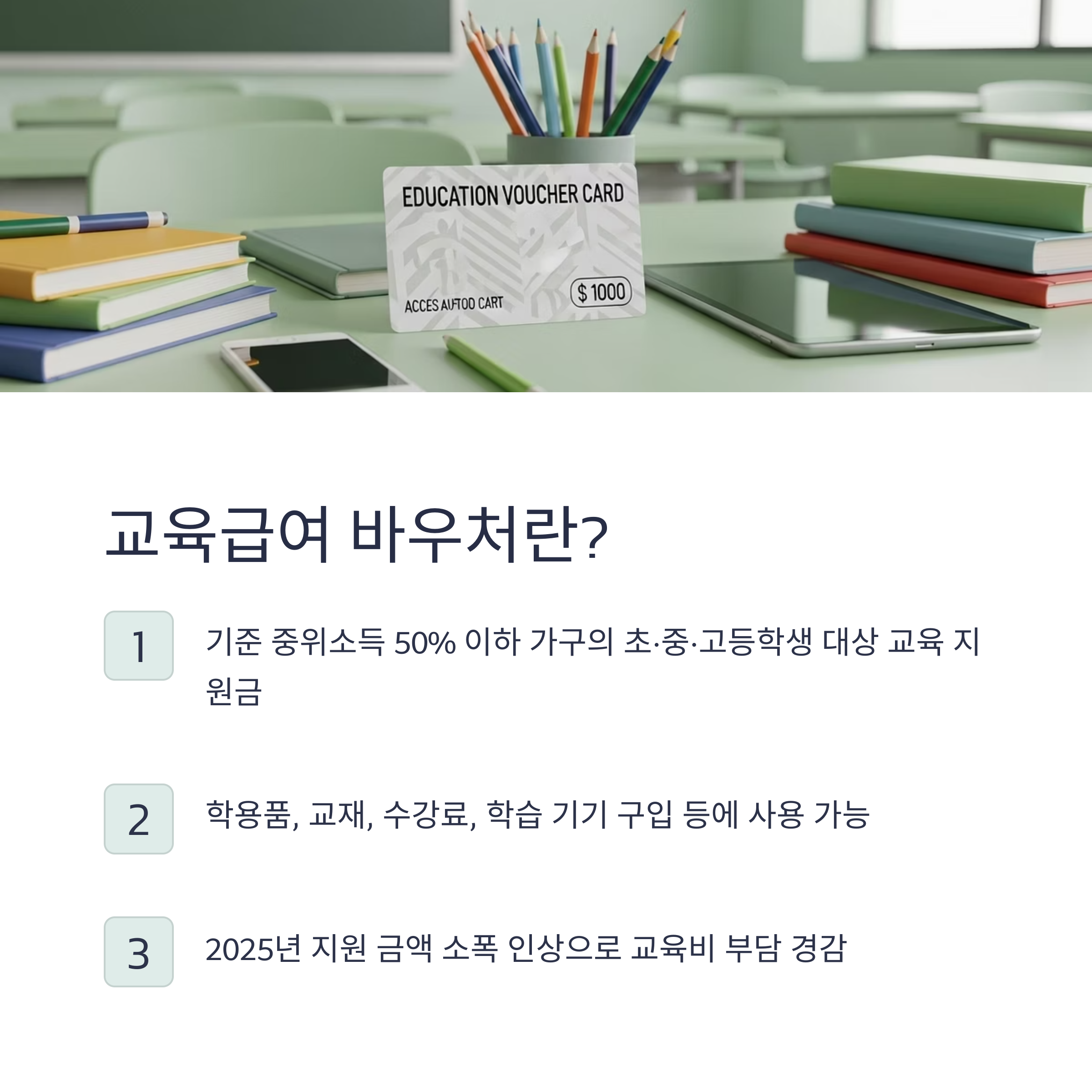 교육급여 바우처는 국가가 초·중·고등학생 중 기준 중위소득 50% 이하 가구를 대상으로 지급하는 교육 지원금입니다. 이 바우처는 학용품, 교재, 수강료, 학습 기기 구입 등 교육과 관련된 다양한 지출에 사용할 수 있도록 설계되었습니다. 특히 2025년에는 지원 금액이 소폭 인상되면서 학부모와 학생들의 실질적인 교육비 부담을 더욱 줄여주고 있습니다.