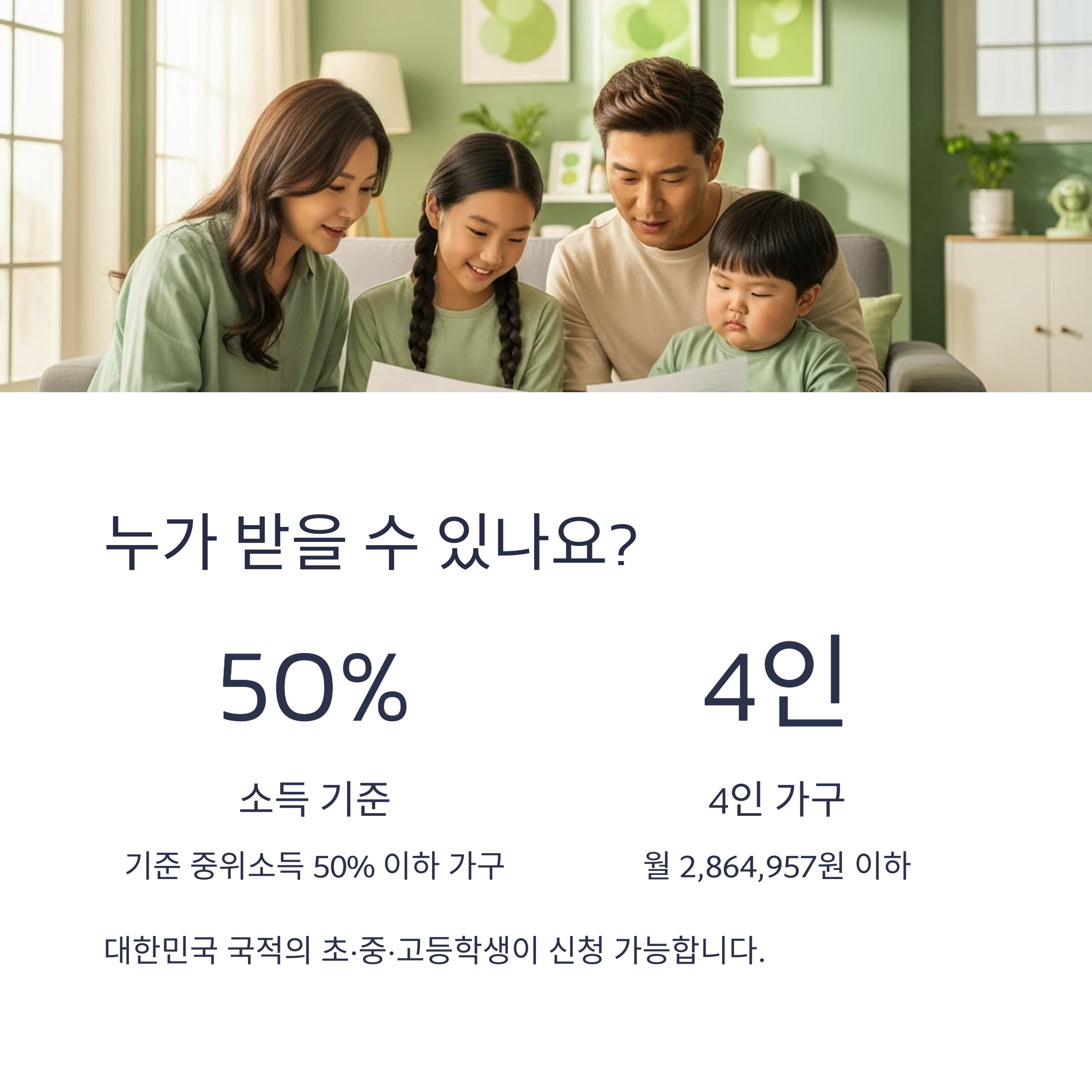 2025년 교육급여 바우처는 대한민국 국적의 초·중·고등학생이면서, 가구의 소득이 기준 중위소득 50% 이하일 경우 신청할 수 있습니다.