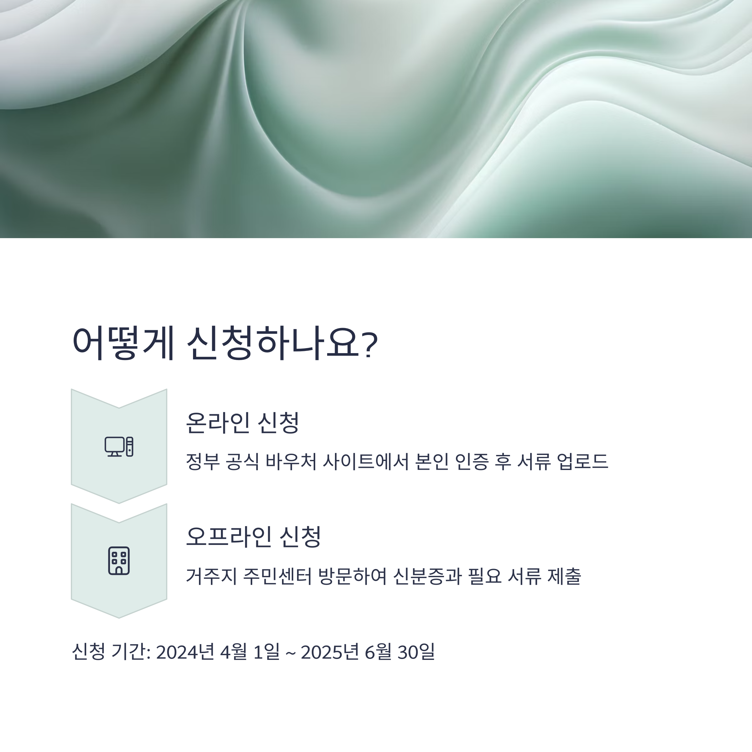 신청 기간은 2024년 4월 1일 ~ 2025년 6월 30일입니다. 온라인 신청은 24시간 가능하며, 주민센터는 오전 9시부터 오후 10시까지 운영됩니다.
