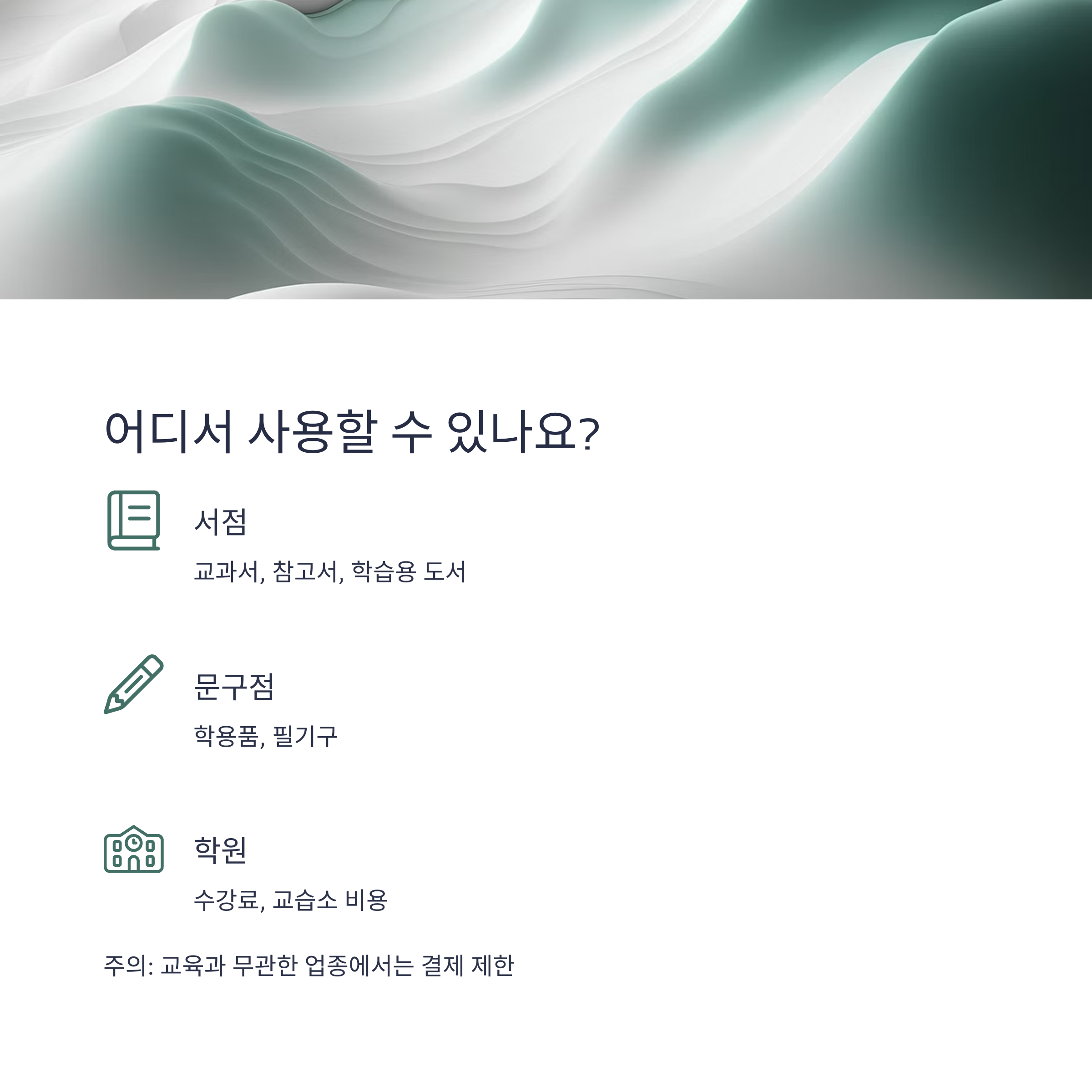 주의: 유흥업소, 도박, 사우나, 마사지, 성인용품점, 미용실, 상품권 구매 등 교육과 무관한 업종에서는 결제가 제한됩니다. 결제는 신용·체크·선불카드, 또는 간편결제 앱(예: 페이코)으로 가능하며, 현금 인출은 불가합니다.