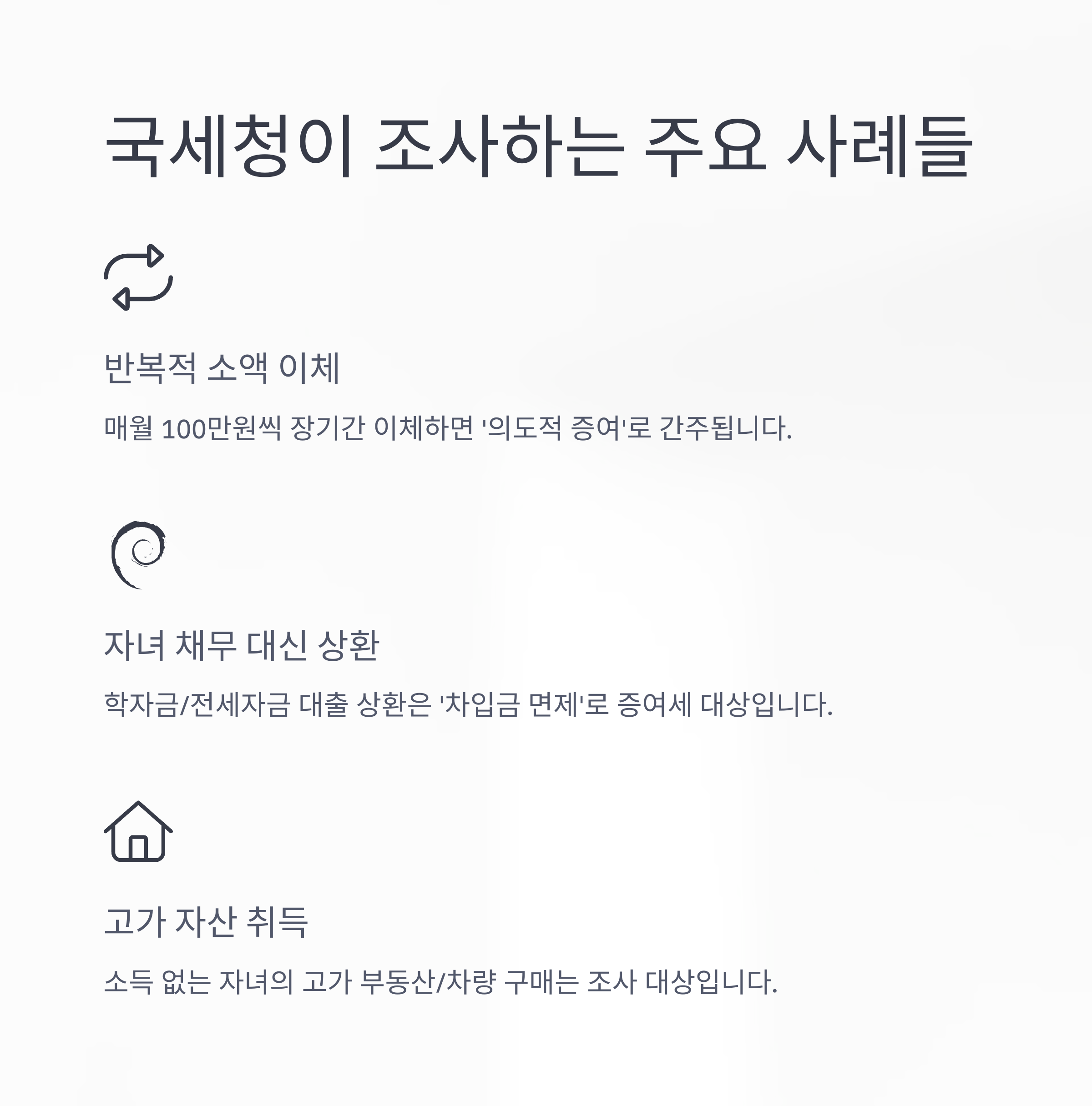 - 자녀가 자산을 매입하거나 대출금을 상환했음에도 불구하고 명확한 소득이 없는 경우, 국세청은 이를 편법 증여로 판단해 세무조사를 실시한다.