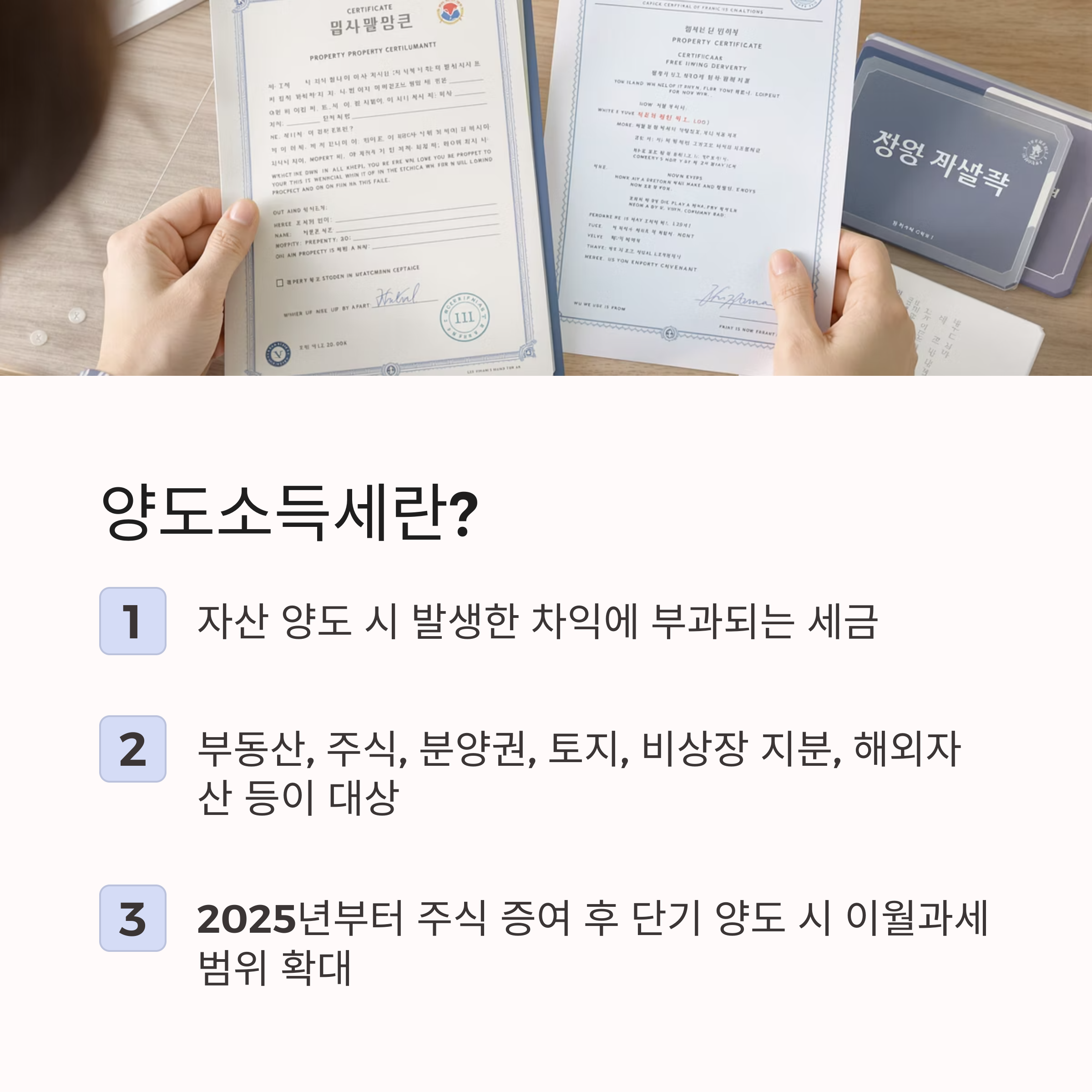 양도소득세는 말 그대로 자산을 ‘양도’할 때 발생한 차익에 부과되는 세금입니다. 여기서 말하는 자산이란 대표적으로 부동산, 주식, 분양권, 토지, 비상장 지분, 해외자산 등을 포함합니다. 단순한 매매뿐 아니라 증여에 준하는 형태로 자산이 이전되는 경우도 과세 대상이 될 수 있습니다.