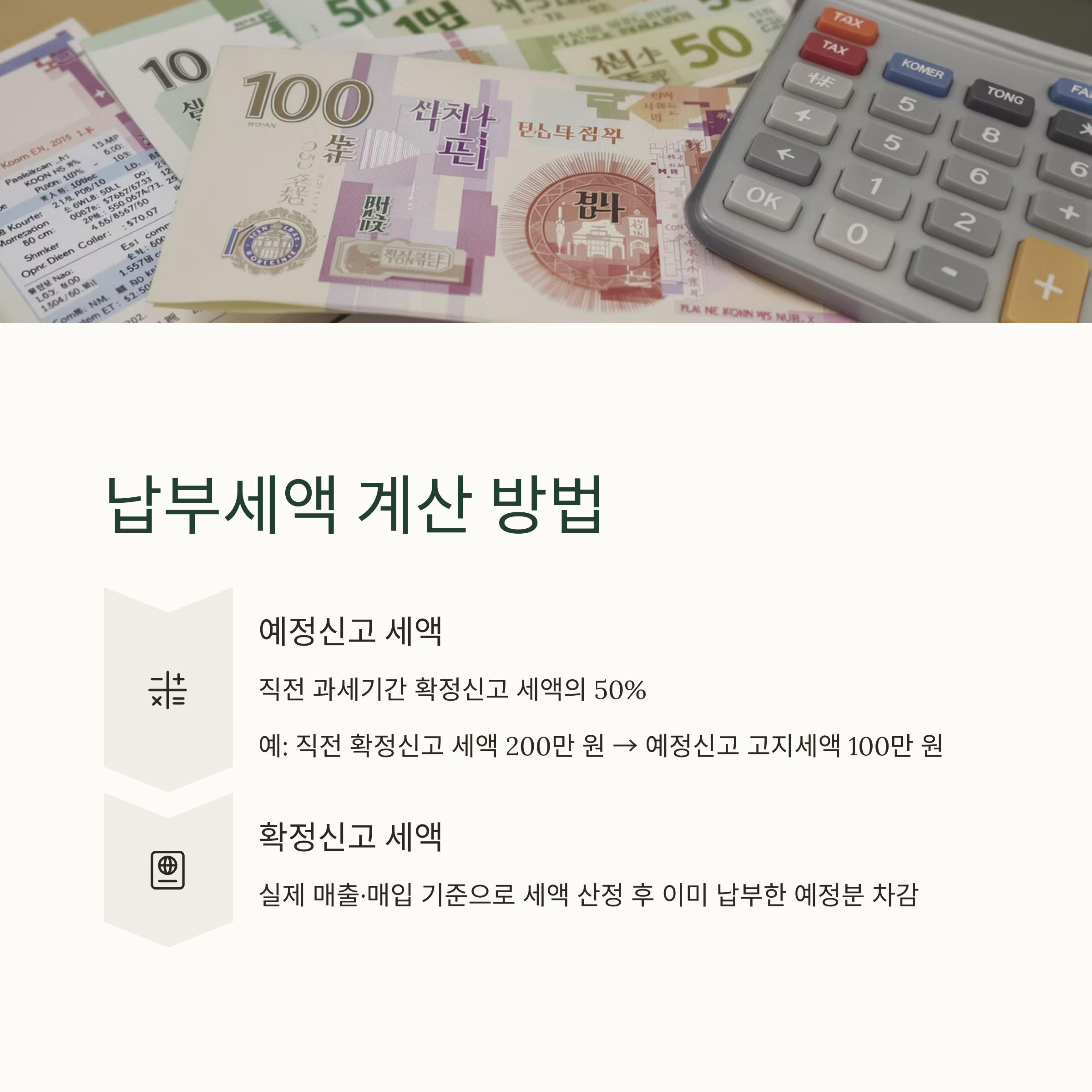 - 예정신고 시 세액: 직전 과세기간 확정신고 세액의 50%가 원칙입니다. (예: 직전 확정신고 세액이 200만 원 → 예정신고 고지세액은 100만 원)