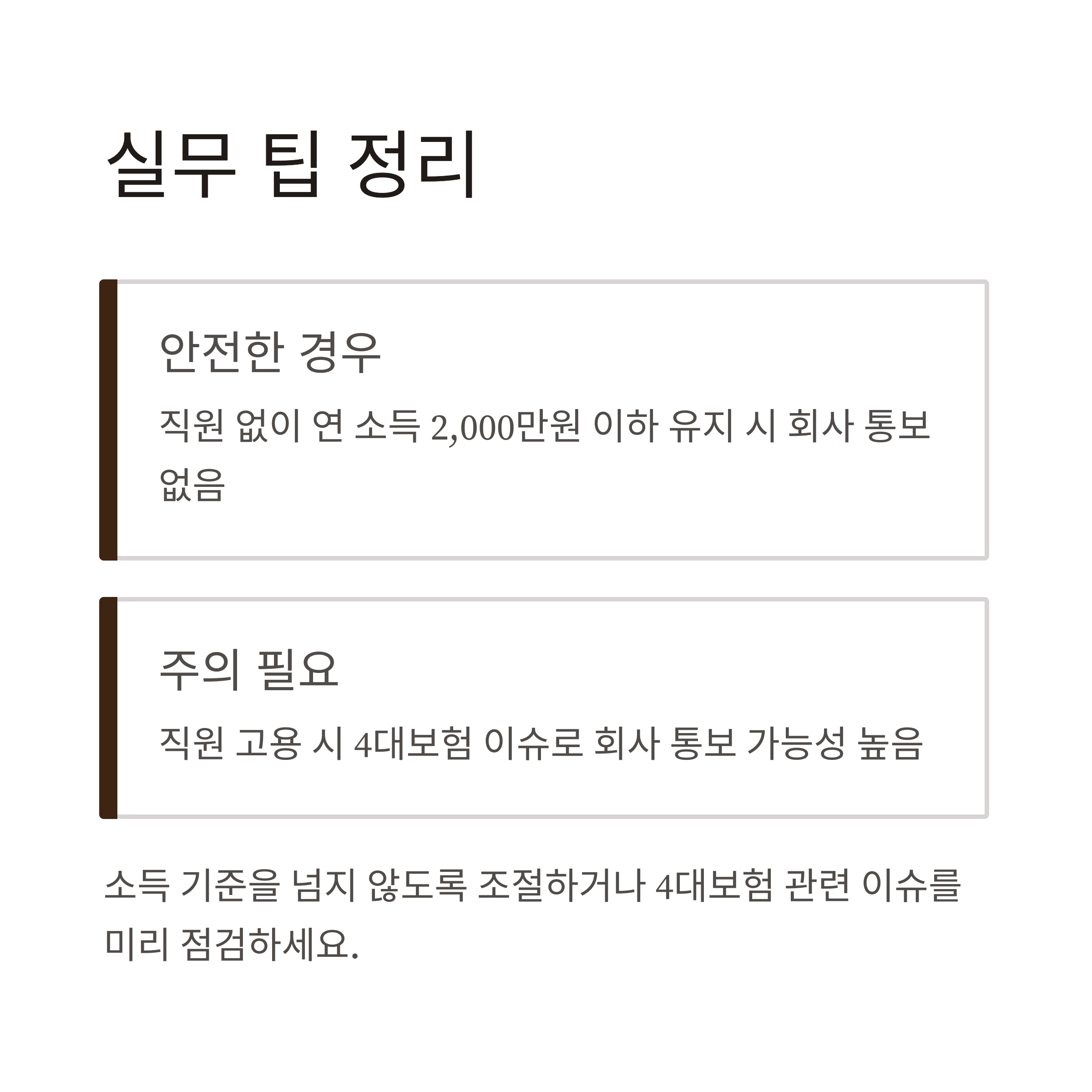 ✔ 단, 직원을 고용하거나, 소득이 일정 기준을 초과하면 보험료 조정 과정에서 회사에 통보될 수 있다.