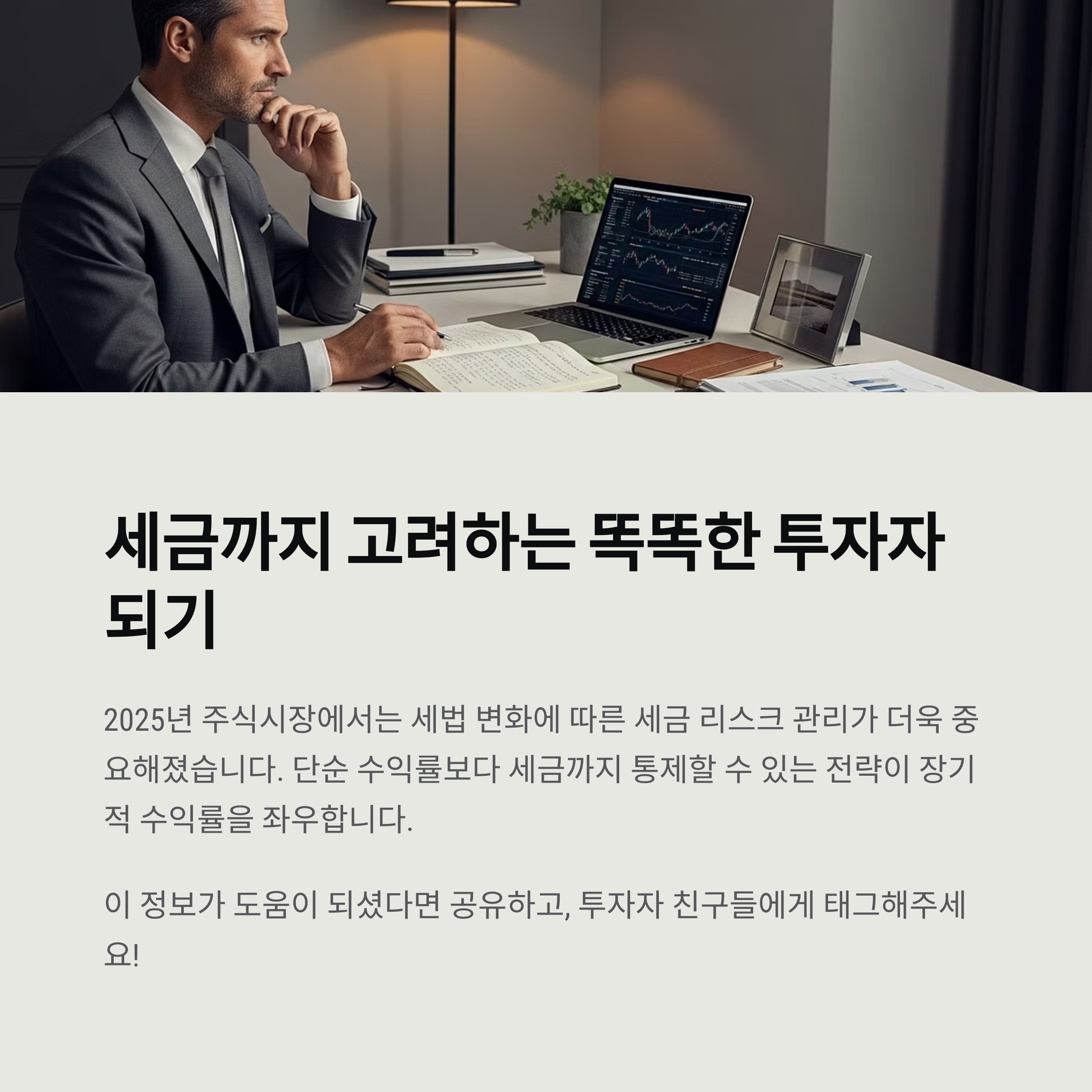 2025년 주식시장에서는 세법 변화에 따른 세금 리스크 관리가 더욱 중요해졌습니다. 단순히 수익률만 추구하는 투자보다, 세금까지 통제할 수 있는 전략이 장기적인 수익률을 좌우하게 됩니다. 정확한 세금 계산과 사전 준비, 그리고 필요 시 전문가의 도움을 받는 것은 선택이 아닌 필수입니다. 세금도 전략입니다. 오늘부터 철저히 준비하세요.