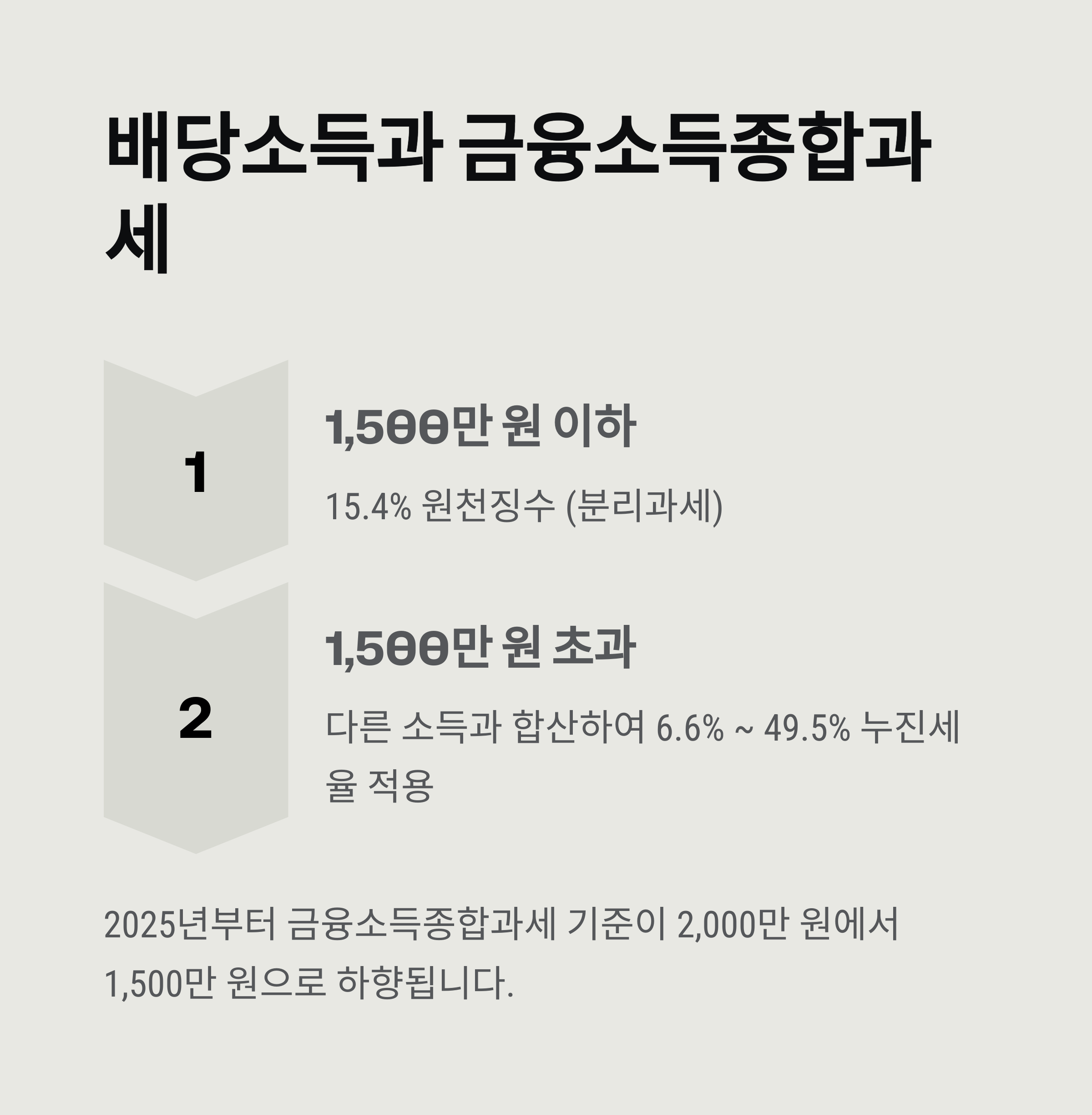 2025년부터 금융소득종합과세의 기준이 기존 2,000만 원 → 1,500만 원으로 하향됩니다. 즉, 연간 배당금과 이자소득의 합계가 1,500만 원을 초과하는 경우, 다른 소득과 합산하여 종합소득세 대상이 됩니다.